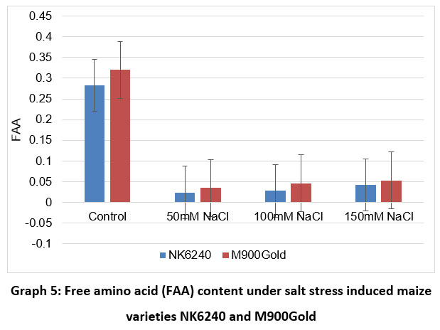 Graph 5: Free amino acid (FAA) content under salt stress induced maize varieties NK6240 and M900Gold |