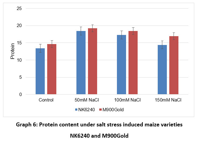 The elevated levels of soluble sugars contribute to tolerance of plants against stress conditions11. Similarly, the maize plants have shown increasing levels of TSS with increasing salt concentration (Graph 3). The maize variety M900Gold have shown high levels of TSS than NK6240, indicating its sensitivity against salt stress.
