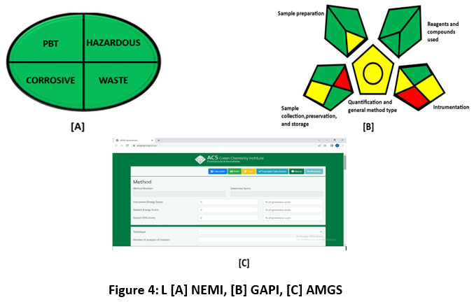 Green Analytical Chemistry (GAC) is centered on creating eco-friendly analytical techniques by reducing the use of hazardous reagents, minimizing waste, and promoting sustainable chemical analysis. It originates from the broader field of “green chemistry,” which seeks to mitigate the environmental impact of chemical processes. GAC emphasizes several key strategies: replacing toxic reagents with safer alternatives, miniaturizing procedures to minimize the volume of chemicals used, and automating processes to enhance efficiency and reduce human exposure to hazardous substances.1These strategies significantly reduce the consumption of reagents and the generation of waste, thus mitigating the environmental impact. Additionally, GAC promotes the integration of on-line decontamination or passivation techniques, which involve treating waste as it is generated to neutralize harmful substances before they can cause environmental harm. This approach not only makes analytical methods greener but also supports the broader goal of sustainable chemistry by ensuring that the entire lifecycle of an analytical process, from sample preparation to waste management, is environmentally responsible. GAC thus represents a crucial advancement in the effort to make chemical analysis more sustainable and less harmful to the planet2 To align with sustainability standards, GAC offers extensive resources on green awareness, with a growing focus on green assessments over the past decade. This has included the development of various metrics to quantify the sustainability of methods. These tools not only guide scientists but also motivate them to adopt more environmentally responsible practices. The use of chemicals, energy use, sample volumes, extraction durations, and waste generation are among the important variables assessed. A number of reviews have recently looked at the suggested green metrics.3,4