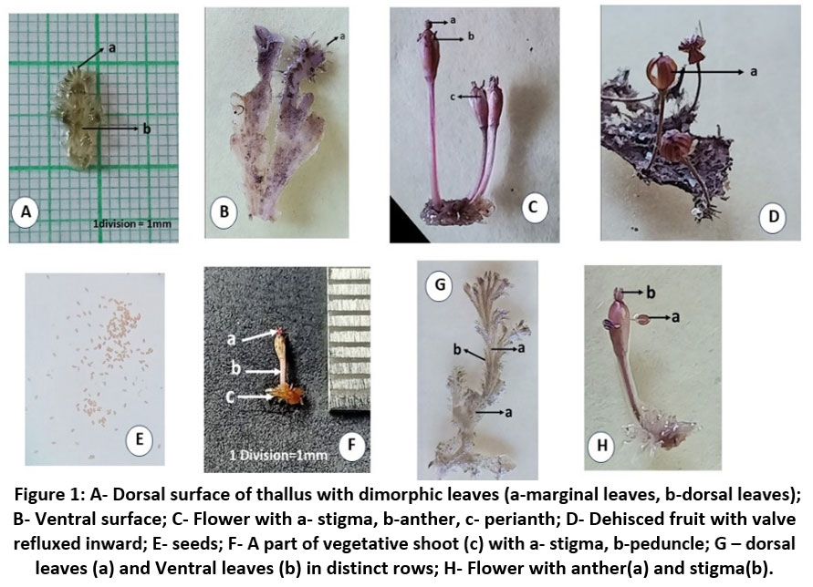 Figure 1: A- Dorsal surface of thallus with dimorphic leaves (a-marginal leaves, b-dorsal leaves); B- Ventral surface; C- Flower with a- stigma, b-anther, c- perianth; D- Dehisced fruit with valve refluxed inward;Click here to view Figure |