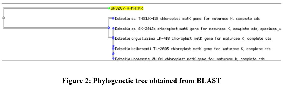 The obtained DNA sequences were analyzed using the NCBI Nucleotide BLAST (BLASTn) tool (https://blast.ncbi.nlm.nih.gov/) to compare them with existing sequences in the GenBank database for species identification and similarity assessment. The sequences were submitted in FASTA format, and MEGA-BLAST, an algorithm optimized for highly similar sequences, was used for analysis. The results were filtered based on 100% query coverage and ≥98% sequence identity to ensure accurate species identification. The BLAST output provided a ranked list of matching sequences, displaying key parameters such as Max Score, E-value, Identity Percentage, and Query Coverage. The top hits were carefully examined, and sequences with high similarity consistently matched species within the genus Dalzellia (Fig.4). The strong alignment between the obtained sequences and the reference sequences in the database confirmed the taxonomic identity of the plant sample. This analysis provided molecular validation of the plant’s classification, demonstrating a high degree of confidence in its genetic identification.