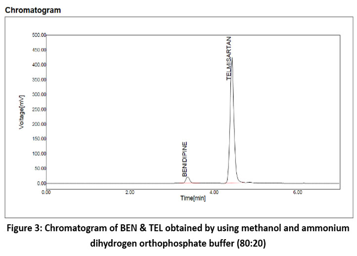 Figure 3: Chromatogram of BEN & TEL obtained by using methanol and ammonium dihydrogen orthophosphate buffer (80:20).Click here to view Figure |