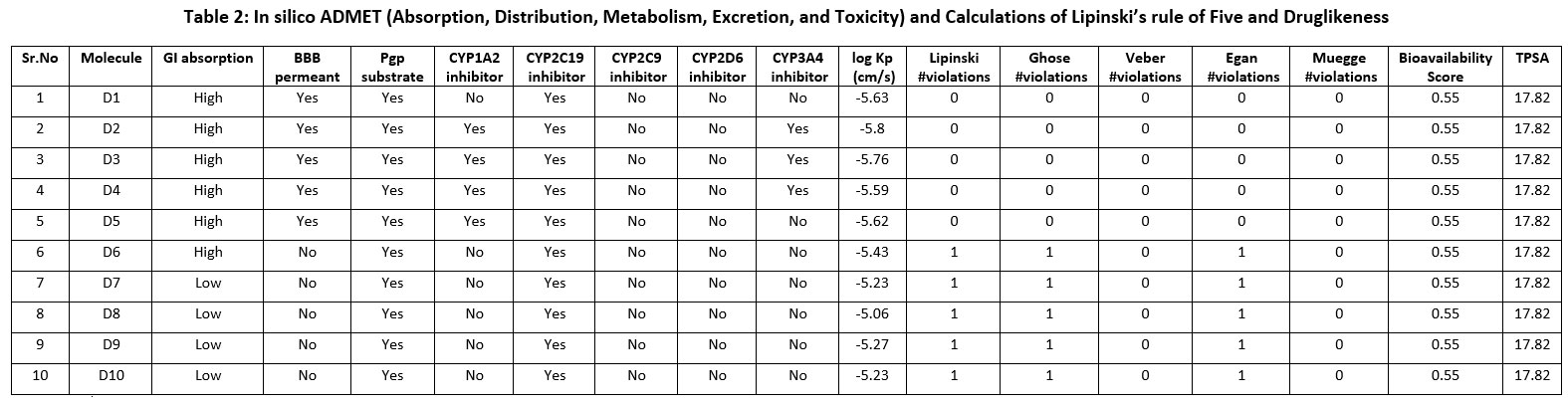 Table 2: In silico ADMET (Absorption, Distribution, Metabolism, Excretion, and Toxicity) and Calculations of Lipinski’s rule of Five and Druglikeness |