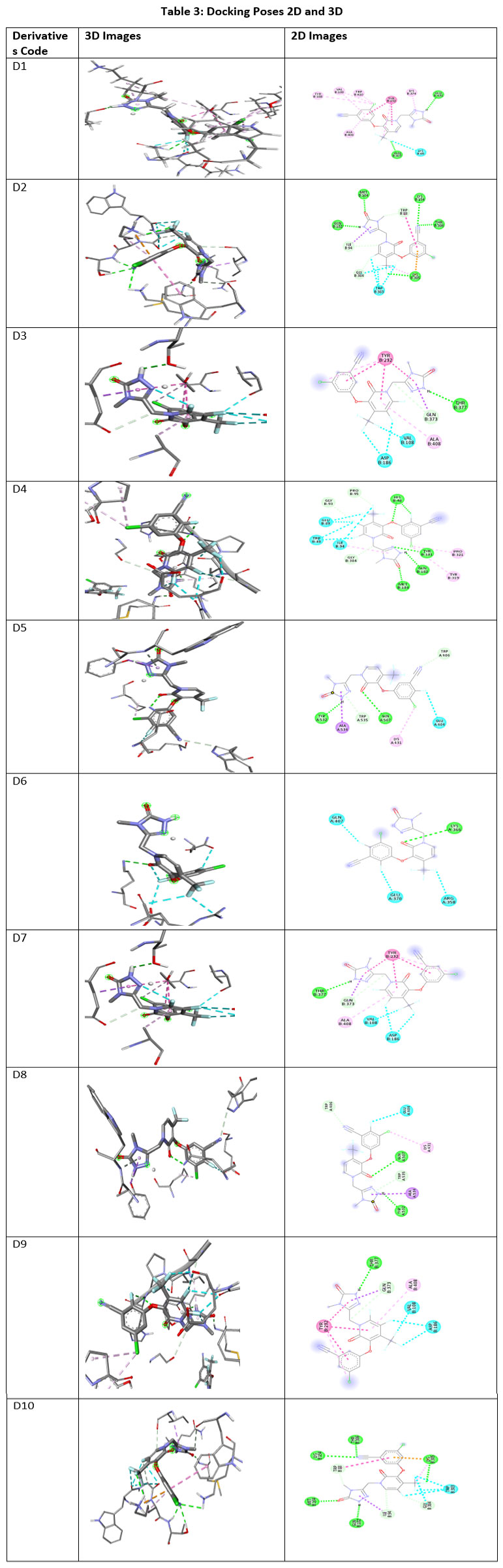 Molecular modelling utilizes quantum techniques to evaluate possibility of interaction, including cytochrome P450s, which has role in ADME processes.22-25 QSAR techniques is commonly used for data modellingof Derivative’s 1–Derivative’s 10. These look for relationships between a collection of chemical and structural molecules likes GI absorption; BBB permeant; Pgp substrate; CYP1A2 inhibitor; CYP2C19 inhibitor; CYP2C9 inhibitor; CYP2D6 inhibitor; and CYP3A4 inhibitor in question and certain property using statistical methods.26-28 Choosing appropriate mathematical method, appropriate chemical descriptors for ADMET endpoint, sizable enough collection of data pertaining with same endpoint for model validation are all essential components of effective prediction models for ADMET parameters. Good ADMET property prediction techniques are becoming more and more necessary to achieve two main goals.29-31 In order to lower the risk, novel compounds libraries should be designed first. Secondly, screening and testing should be optimized by focusing on the most promising compounds. Predicting characteristics like oral absorption, bioavailability, BBB penetration, clearance, and Vd (for frequency) which give information about dosage quantity and frequency is our goal. Molecular modelling and data modelling are the two categories of computational techniques that are employed.32-33 Recent developments in the prediction of ADME-related physicochemical qualities (like lipophilicity), ADME properties (like absorption), and toxicity problems (like drug–drug interactions) are discussed in this article see Table number 2. During the next ten years or so, automated medium and HTS in-vitro tests will be employed.Another potential future avenue for molecular docking techniques is the creation of methods that might enhance the prediction of RT inhibition. We believe that developing new techniques that allow for the consideration of small molecule pharmacophores in addition to docking data may be beneficial. There is also a great need for new methods that machine learning techniques to improve docking scoring functions might result in a notable improvement in the prediction value of molecular docking. Specifically, there are several studies that used different machine learning techniques to estimate the binding affinities of different sets of ligands. Given the information on mutations and resistance linked to them, we suggest that it may be extensively utilized in HIV-1 resistance research. Together with docking findings, information about the correlations between the prevalence of a certain mutation and decreased drug sensitivity may be utilized as descriptors in machine learning. We propose that the ability to incorporate information on the 3-dimensional complex inhibitor into the model can result in notable enhancements in the prediction of pharmacological activity.QSAR is one such technique that was covered drug discovery in the above session/chapter. In this above session/chapter will cover the newly developed idea of “drug-likeness” as well as the computer modelling of a number of biological and physicochemical characteristics that are crucial in turning a clinical lead into a commercially available medication. Pharmacologists and medicinal chemists have looked for beneficial drug-like chemical characteristics that produce agents with predictable oral therapeutic effectiveness. Drug development process follows Lipinski’s “rule of five” which is computational and experimental method for estimating solubility, permeability. 3LAM (PDB 00003lam)enzymes were docked with the drugs, and the molecular interactions between them were examined. Tables number 4 summarize interactions between chemicals with residues of dynamic amino acids, whereas Table number 3 display the 2D – 3D conformations for molecular bindingsof Derivative’s 1–Derivative’s 10. Computer-aided molecular design (CAMD) has traditionally concentrated on lead optimization and identification, and several creative techniques have been created to help increase the binding affinities of drug candidates to certain receptors. Those are general guideline which assesses drug-likeness and establishes whether molecule has pharmacological activity. The rule was founded on the finding that the majority of medications that work well when taken orally are tiny, somewhat lipophilic molecules. It is employed in the process of developing new drugs when pharmacologically active lead structures are gradually improved to boost their activity and selectivity while maintaining their drug-like physicochemical characteristics. Bonds rotation; H-bond acceptors; H-bond donors; Lipinski; Ghose; Veber; Egan and Muegge violations were given in Table number 2. ADMET (which stands for absorption, distribution, excretion, and toxicity) characteristics for substances are necessary to create effective oral medications. The toxicity of a ligand is thought to be required to ligand as function to effective discovery tool, and Qik-Prop produces physically relevant descriptions. The Ligprep module used for ligand preparation utilized in investigation. The protein preparation wizard utilized for protein preparation. The PDB data bank provided the X-ray crystal structures of 3LAM (PDB 00003lam), based on the optimal ligand-protein interaction, the scoring function assigns points. The extra-precision mode was used to assess the docking positions. The program detects steric conflicts, metal-ligation interactions, hydrophobic interactions, and hydrogen bonding. Every substance has a molecular weight between 400 and 500, which is less than 500. The compounds’ computed log P values fall between 3.56-5.35. The substances being studied have donors of hydrogen bonds.