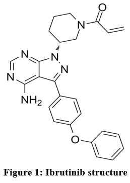 Ibrutinib received FDA approval in 2014 for chronic lymphocytic leukemia and in 2013 for mantle cell lymphoma. Additionally, it treats Waldenstrom macroglobulinemia, Chronic graft-versus-host disease, small lymphocytic lymphoma, marginal zone lymphoma, and chronic lymphocytic leukemia. By blocking the aberrant protein that gives cancer cells signals to proliferate, the medication slows the growth of cancer cells.3-7 The chemical structure of Ibrutinib was displayed in Fig 1.