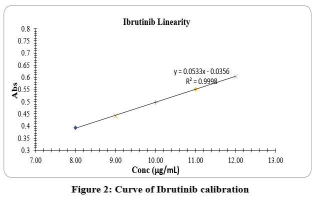 Blank and placebo were not having interference at absorption maxima of Ibrutinib. UV spectrum of Test Solution found concordant to that of standard solution. Absorption maxima of Test sample found within ± 2 NM to that of Absorption maxima of Standard solution. Hence developed UV method passed the criteria for specificity.